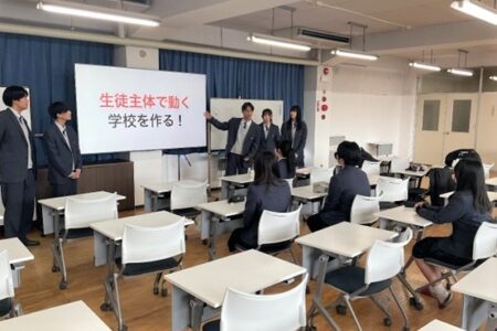午前中は、オリエンテーションのあと、生徒会との交流や授業への参加がありました。